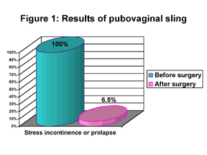 Of the past one hundred women undergoing sling procedures, the women who have allograft fascia slings (tissue bank human sling material) have had the best results. While most women have stress incontinence prior to surgery, several have had severe prolapse causing urinary retention, despite urethral hypermobility. Slings are placed in the setting of severe prolapse, even in the absense of incontinence, to prevent incontinence from occurring after reconstruction of vaginal prolapse. Of women with severe prolapse or stress incontinence, 93.5% report resolution of stress incontinence. Of the remaining 6.5% with mild stress incontinence, most are managed successfully with an addition of a collagen implant (see figure 1). Three quarters of women presenting for slings have associated urgency incontinence. While sling surgery is not specifically a treatment of urge incontinence, 53% report resolution of urgency following sling surgery. Eight percent of women without urgency before surgery develop new urgency after surgery.